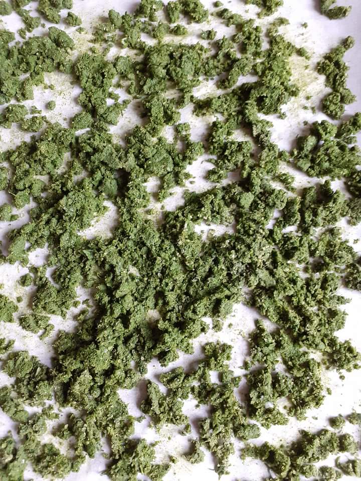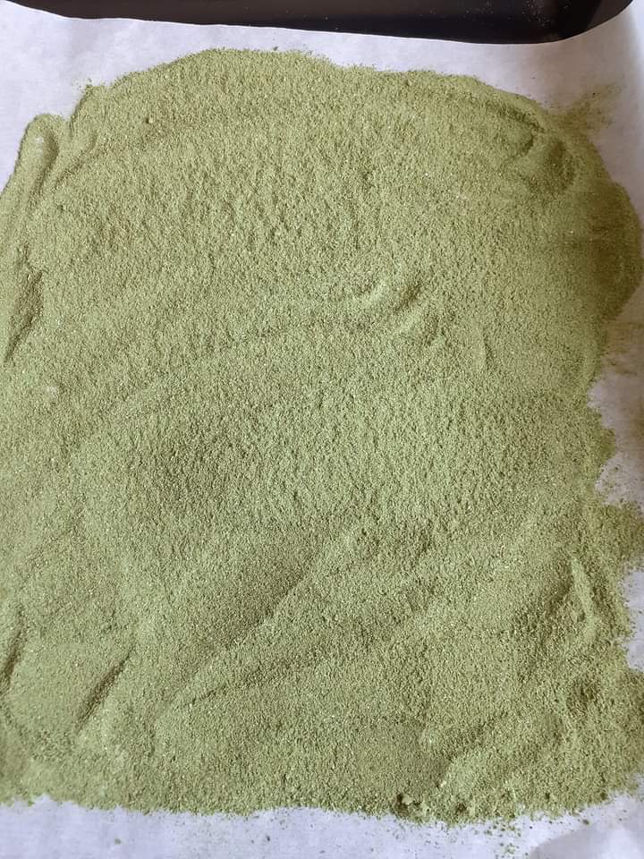 Felaprítottam őket és 100 gr zöld anyaghoz 200 gr durva sót adtam. Majd mix. Ebből lett a fenti fotón látható anyag. Ha kiszárad, ami nyáron a konyhában kb 3 nap, ismét meg kell őrölni, zöld port kapunk, lásd alább, üvegbe töltés előtt szintén száradjon kicsit. Sütőben max 40 fokon végezzük a szárítást, és tartós, ízletes fűszersónk lesz.